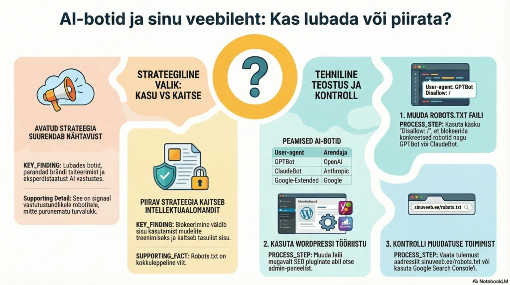 AI-mudelid (nt GPTBot, ClaudeBot, PerplexityBot, Google-Extended) käituvad nagu teisedki veebirobotid. Nende ligipääsu saab juhtida robots.txt failiga. See on strateegiline valik: kas lubada sisu kasutamist ja tsiteerimist või piirata seda.